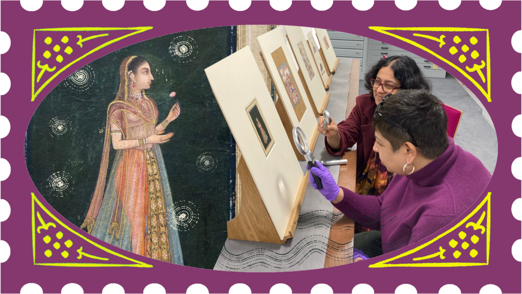 We were handed a pair of gloves and two magnifying glasses as we entered. On a table no longer than two feet, easels held paintings on one side, while material objects lay carefully arranged on the other. We began with the Mughal era paintings.