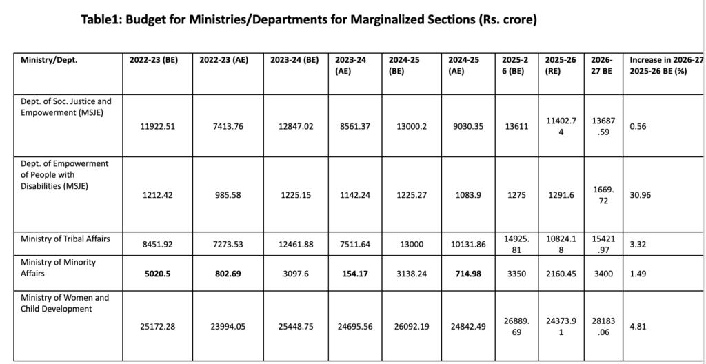 The budgets of important ministries that serve socially marginalised sections – Social Justice & Empowerment (Dalits, PwD and other marginalised populations), Tribal Affairs, Minority Affairs, and Women & Child Development – have not seen any significant increase in 2026-27. It remains at almost the same level as last year’s allocations for the Department of Social Justice and Empowerment and Ministry of Minority Affairs (See table below).