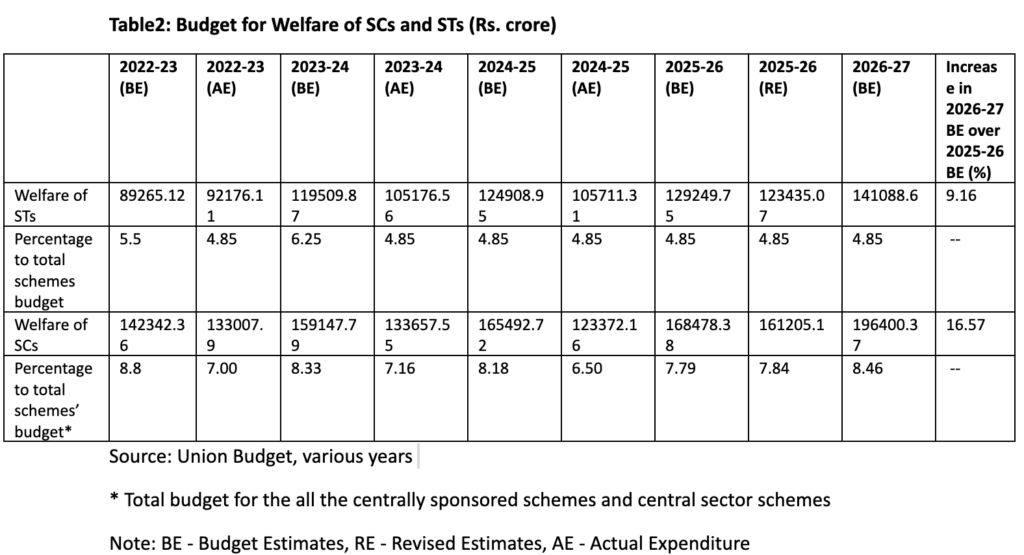 As the table above suggests, the allocations for the Dalit and tribal communities have not shown any increase as percentage of the total schemes’ budget of the Union government over the years and they remain much lower than their share in the country’s population. If anything, the percentage of allocations towards the welfare of SCs and STs to the total scheme budgets have declined slightly since 2022-23.