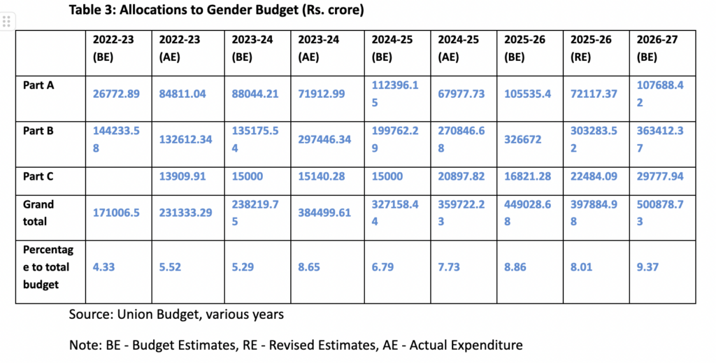 In the year 2026-27, the gender budget has increased from Rs. 4.49 lakh crore in 2025-26 BE to Rs. 5.00 lakh crore in 2026-27 BE, an increase of just Rs. 51 thousand crore. In percentage terms the gender budget increased from 8.86% of the total budget in 2025-26 BE to 9.4% in 2026-27 BE. The increase has been mainly in Parts B (Rs 37000 crore) and C (Rs 13,000 crore) of the GBS.